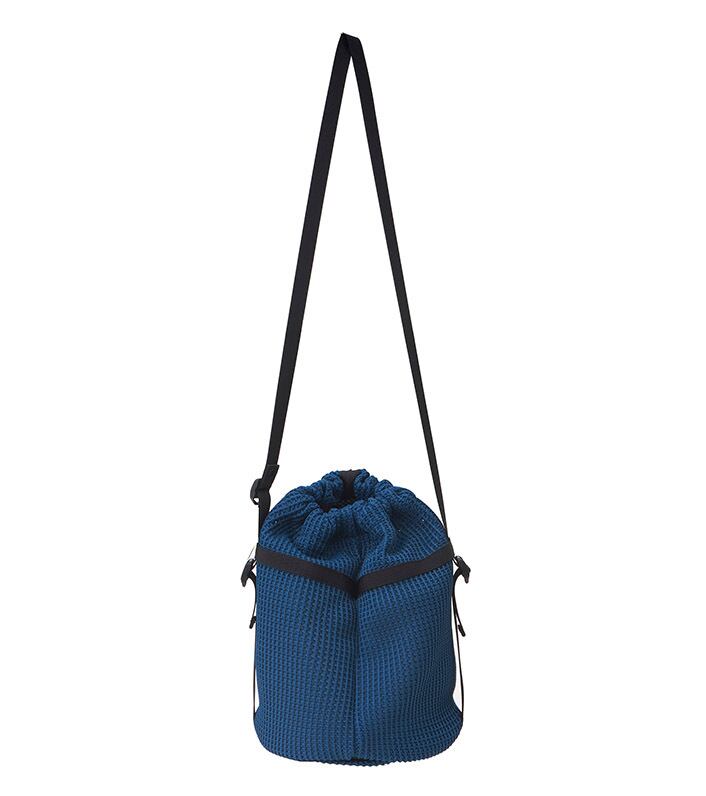 ニットのようなメッシュ生地が特徴のショルダーバッグ。国内では希少なローゲージのラッセル経編機で編み立てられています。寝袋や衣類など圧縮収納するコンプレッションバッグのディテールを参考にデザインしました。ショルダーテープはバックルで長さの調整が可能。サイドのテープを調整する事により、フォルムの変化を楽しめます。