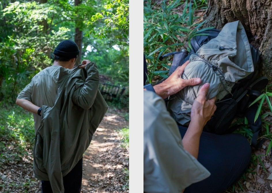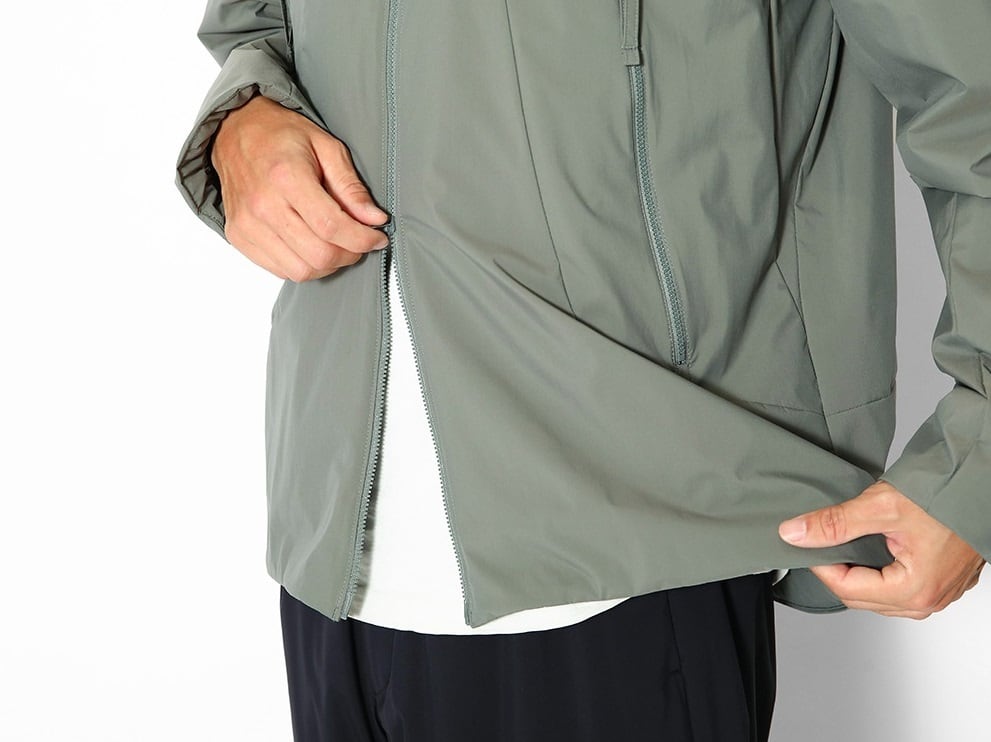 急な天候・温度変化に対応し、アクティブなライフスタイルを快適にサポートする多機能ウェアです。表地には撥水加工を施したストレッチ性のあるポリエステルを使用し、裏からポリウレタンの防水膜をラミネートし透湿防水性をプラス。今シーズンからリサイクルポリエステルを使用しています。裏地には「Octa®」という多機能ポリエステル繊維を採用。繊維の構造が、穴の空いた中空糸に8本の突起を放射線状に配列したタコ足型断面のため、重さが同じ直径のポリエステル繊維に比べて2分の1程度と非常に軽量で、さらには水や汗、空気が通りやすいため吸汗速乾性と断熱性にも非常に優れています。通常の中綿アイテムは表、綿、裏地の3層で構成されているところ、軽い表地と軽い裏地の2層で構成されているため、まるで着ていないかのような非常に軽やかな着心地が特徴です。 フルジップタイプのジャケットは着脱が容易で、さらに軽量でかさばらないため持ち運びも簡単。シーンを問わず様々な場面で活躍します。脇のファスナーポケットはバックパックのウエストベルトに干渉しない高めの位置に配置することで物の出し入れをストレスフリーに。ポケット内部はウォームポケットとしても機能します。さらにはバックパックなどを背負ったときに力がかかりやすい肩の縫い目を背中側に逃がすことで悪天候時の雨の侵入を防いだり、袖など動きの多い箇所のパターンに工夫を施すなど、機能性だけでなくアクティブシーンを想定したディテールワークが快適な着心地を実現しています。